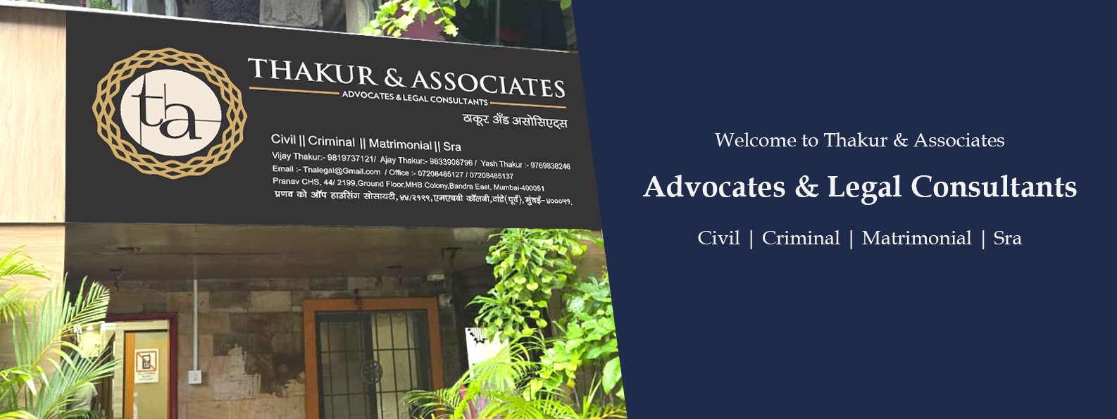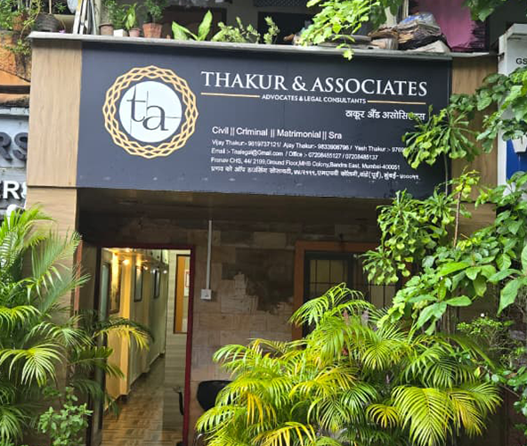 Thakur & Associates is a trusted law firm dedicated to providing comprehensive legal services with integrity, professionalism, and client-focused solutions. With years of experience and a strong presence in Mumbai, we specialize in Civil, Criminal, Matrimonial, and SRA (Slum Rehabilitation Authority) matters, offering expert guidance and effective representation.